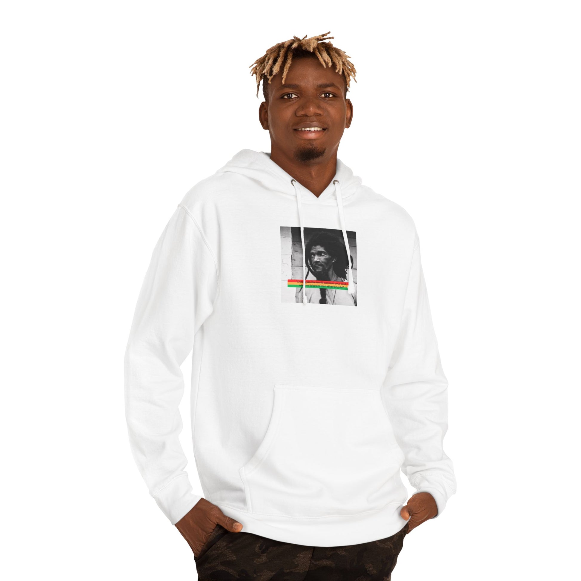 This hoodie carries a quiet, soulful energy — a soft, mid-weight sweatshirt with a centered, vintage-style black-and-white portrait accented by a thin red-yellow-green stripe. It sits comfortably against the body and wears like something you reach for when you want calm and confidence. The jersey-lined hood with drawcords is cozy on rainy walks. Thoughtful construction (ribbed cuffs and hem, double-stitched seams, twill necktape) keeps it looking lived-in rather than worn-out. Wear it to low-key shows, late-night coffee runs, or afternoons at the record shop; it layers easily under a coat or over a tee and adds a subtle, artistic statement without shouting.