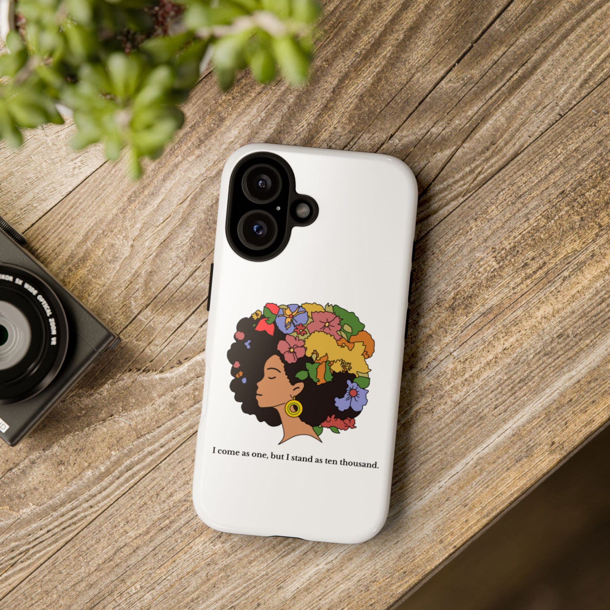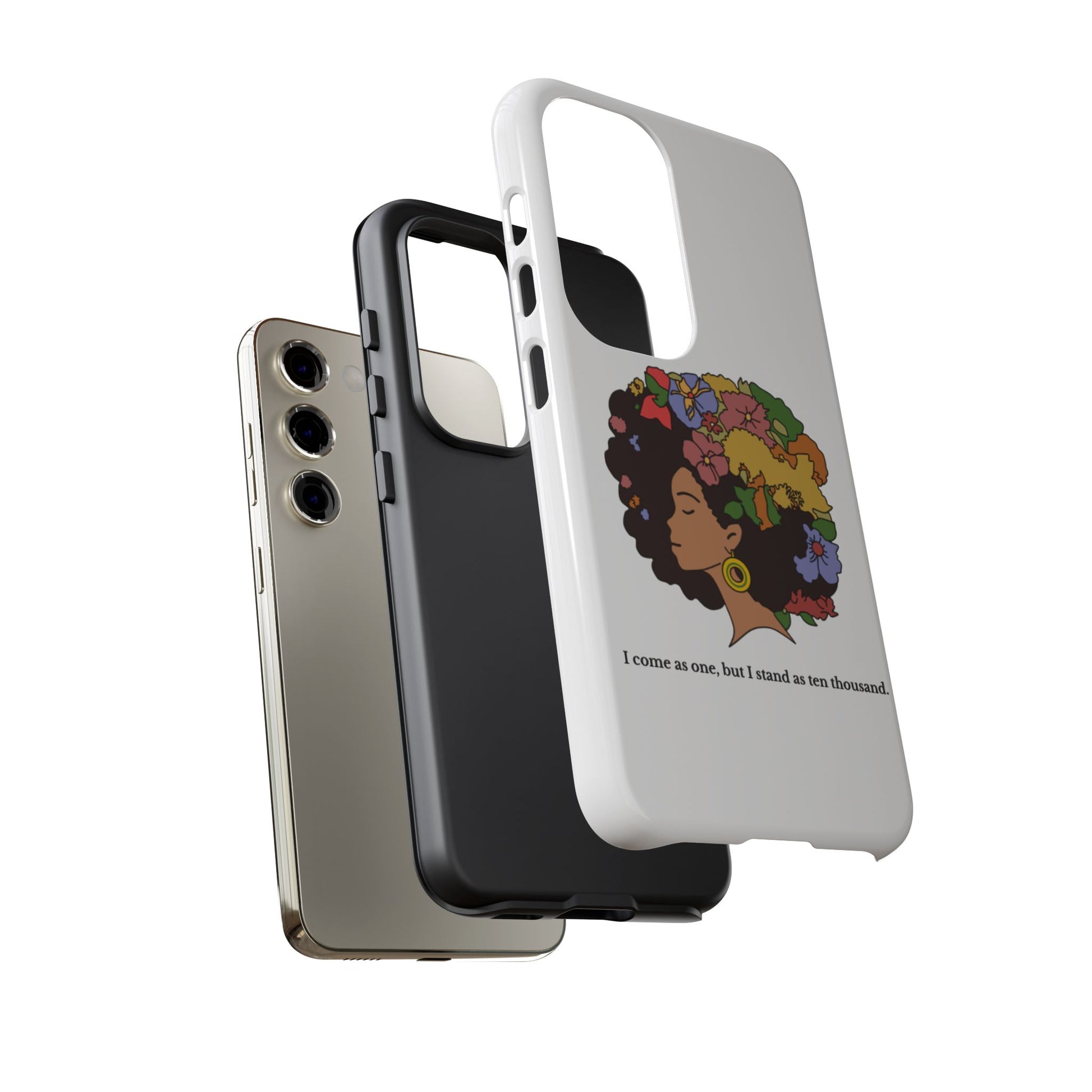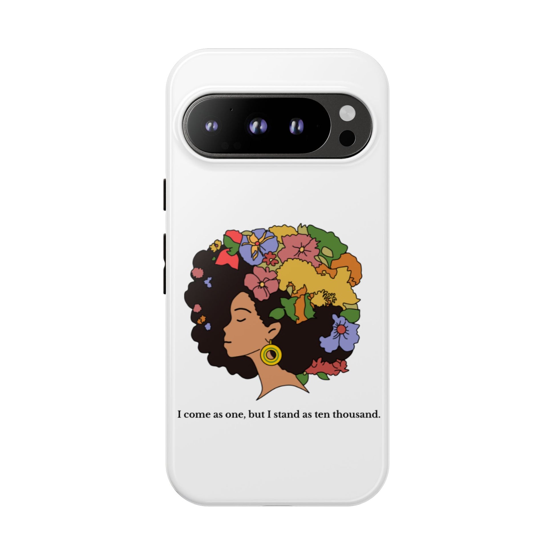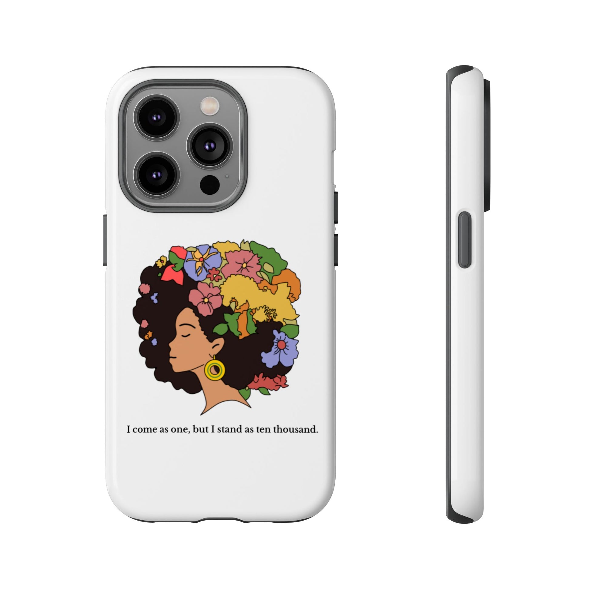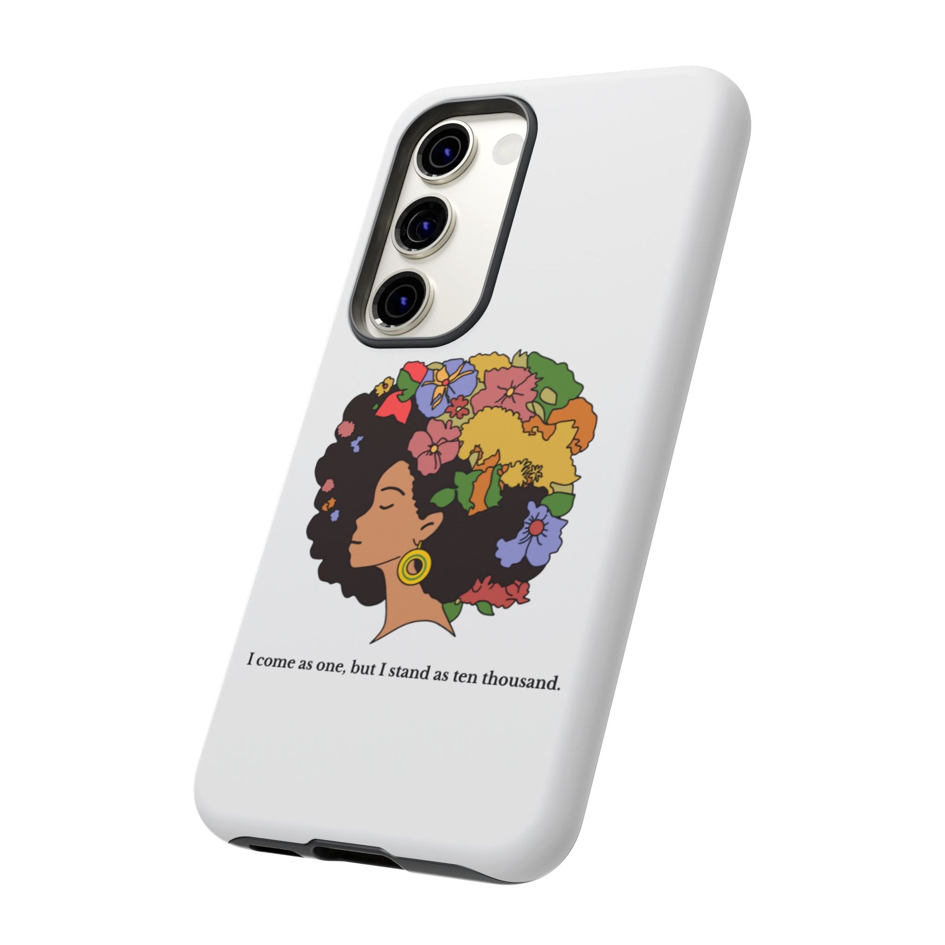 This protective phone case carries a quiet, bold confidence. A silhouette of a woman with a lush, colorful afro blooms across the back — flowers, leaves and butterflies woven into her hair like a living crown. The line beneath reads, “I come as one, but I stand as ten thousand,” turning a small daily object into a personal declaration of resilience and collective strength. The dual-layer shell feels sturdy in hand; the glossy (or matte) surface makes the art pop while the soft TPU liner cushions against drops. It’s for someone who wants their everyday carry to reflect pride, creativity, and a gentle reminder of community whenever they reach for their phone.