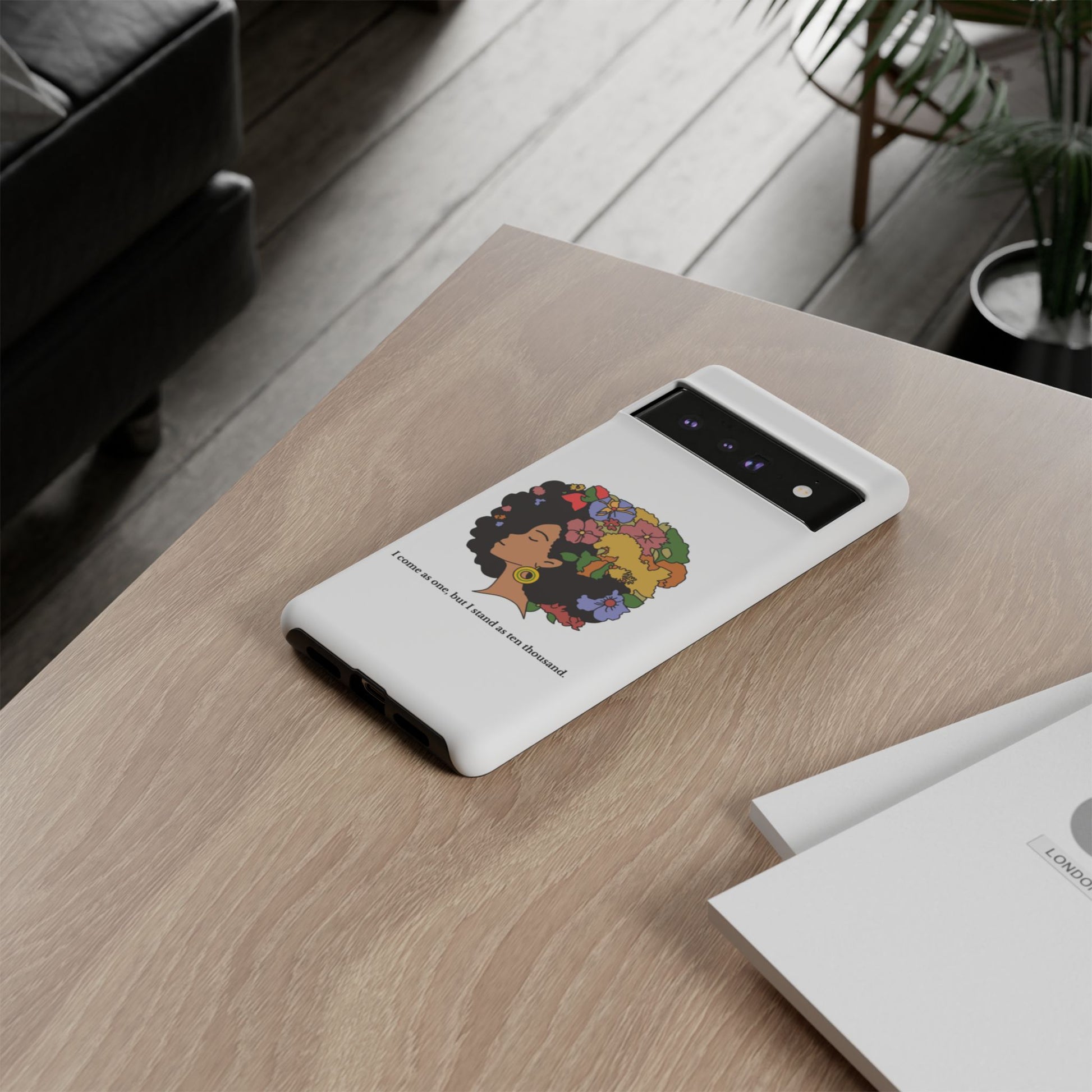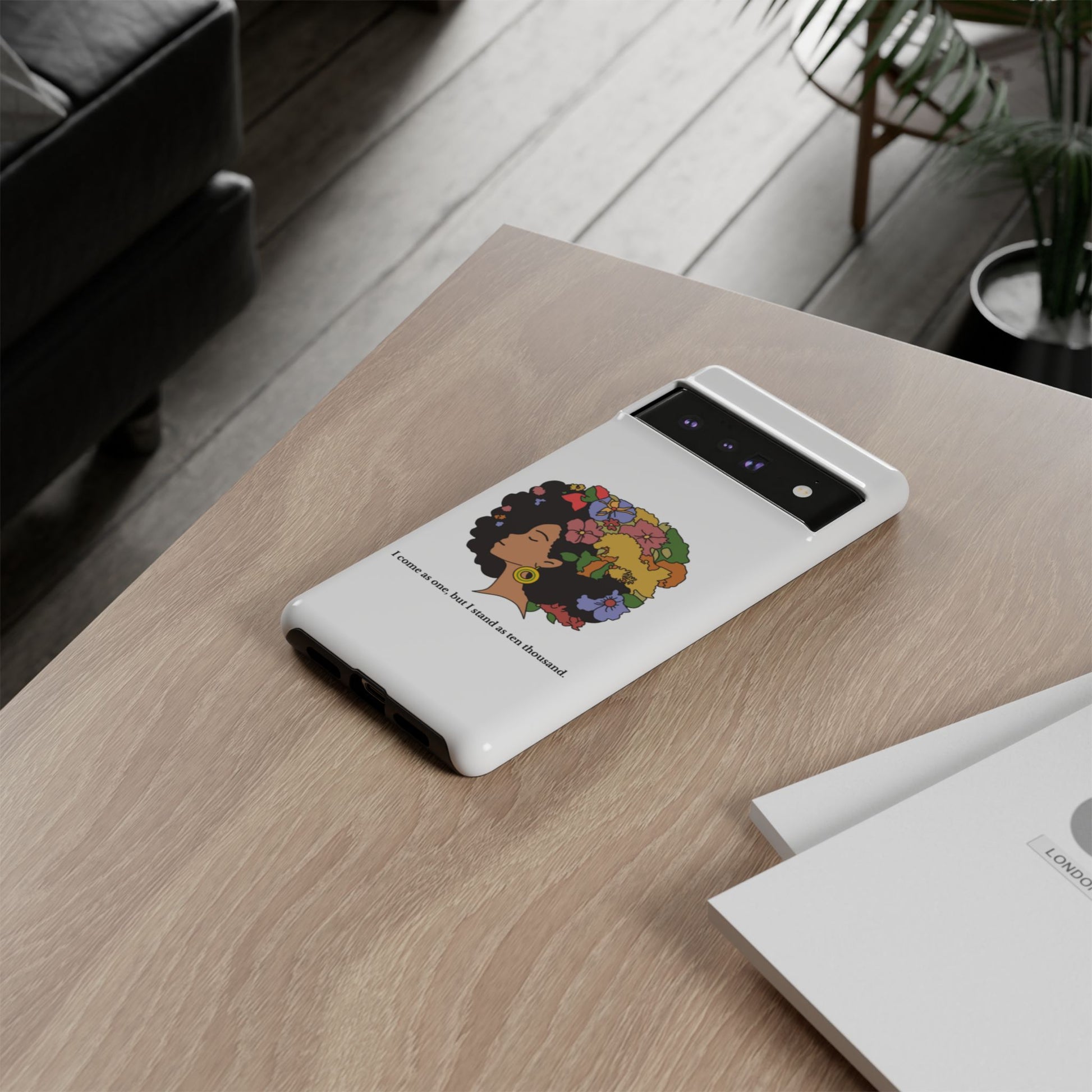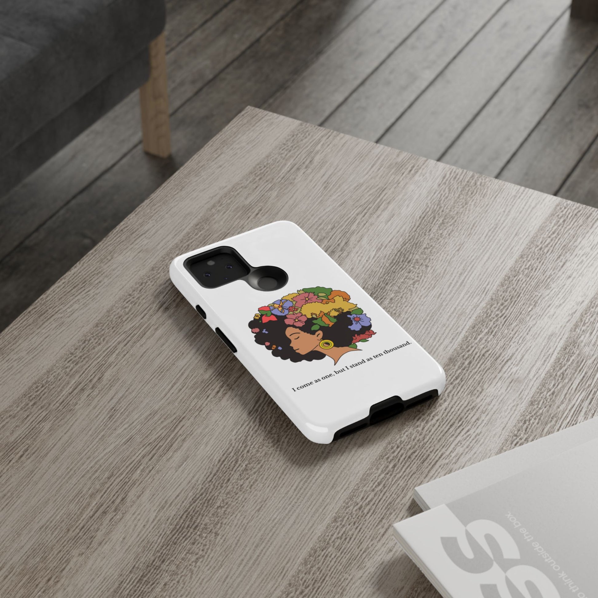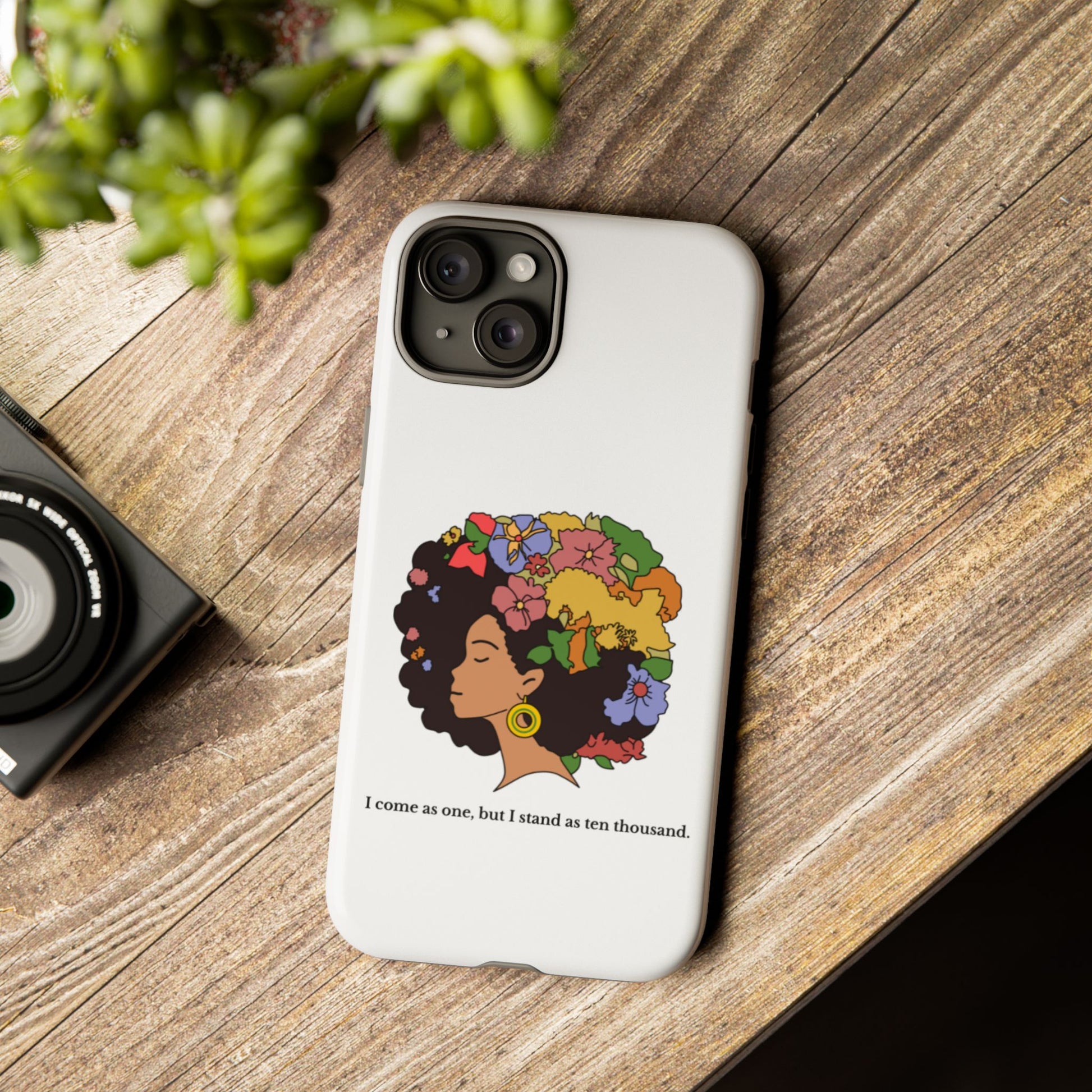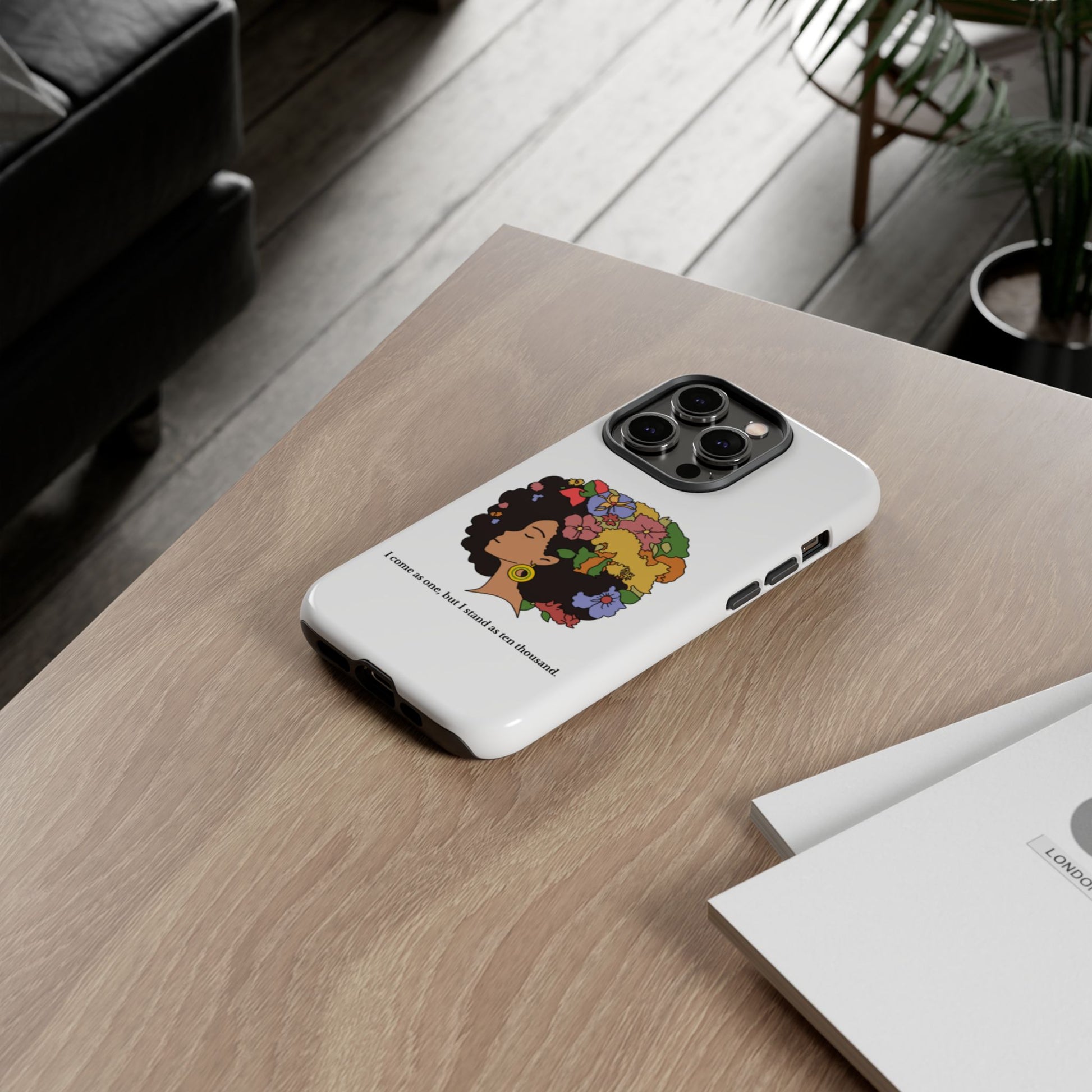 This protective phone case carries a quiet, bold confidence. A silhouette of a woman with a lush, colorful afro blooms across the back — flowers, leaves and butterflies woven into her hair like a living crown. The line beneath reads, “I come as one, but I stand as ten thousand,” turning a small daily object into a personal declaration of resilience and collective strength. The dual-layer shell feels sturdy in hand; the glossy (or matte) surface makes the art pop while the soft TPU liner cushions against drops. It’s for someone who wants their everyday carry to reflect pride, creativity, and a gentle reminder of community whenever they reach for their phone.